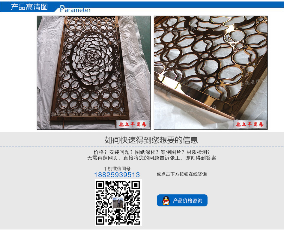 產(chǎn)品尺寸:根據(jù)需求定制 產(chǎn)品材質(zhì):201、304、316L 可選顏色:玫瑰金、鈦金、黑鈦金、香檳金、青古銅、紅古銅、咖啡金、灰色、按樣板定制 適用場(chǎng)所: 酒店、餐廳、會(huì)所、售樓部、商場(chǎng)、別墅、KTV