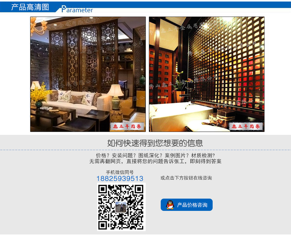 產(chǎn)品尺寸:根據(jù)需求定制 產(chǎn)品材質(zhì):201、304、316L 可選顏色:玫瑰金、鈦金、黑鈦金、香檳金、青古銅、紅古銅、咖啡金、灰色、按樣板定制 適用場所: 酒店、餐廳、會(huì)所、售樓部、商場、別墅、KTV