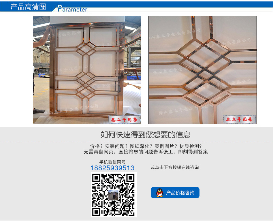產(chǎn)品尺寸:根據(jù)需求定制 產(chǎn)品材質(zhì):201、304、316L 可選顏色:玫瑰金、鈦金、黑鈦金、香檳金、青古銅、紅古銅、咖啡金、灰色、按樣板定制 適用場所: 酒店、餐廳、會所、售樓部、商場、別墅、KTV