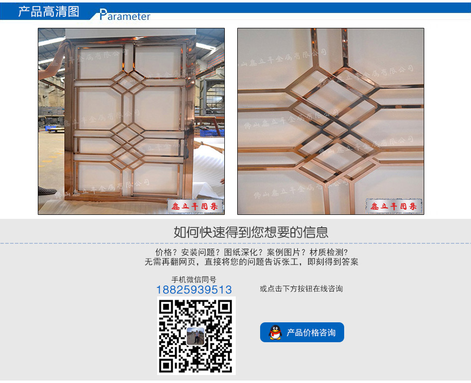 產(chǎn)品尺寸:根據(jù)需求定制 產(chǎn)品材質(zhì):201、304、316L 可選顏色:玫瑰金、鈦金、黑鈦金、香檳金、青古銅、紅古銅、咖啡金、灰色、按樣板定制 適用場(chǎng)所: 酒店、餐廳、會(huì)所、售樓部、商場(chǎng)、別墅、KTV